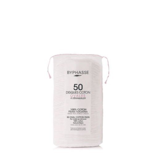 BYPHASSE 50 Disques Coton Ovales Démaquillants, démaquillent facilement et enlèvent les impuretés.