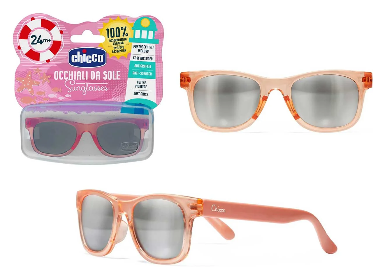 Les lunettes de soleil Chicco 24M+ sont dotées de branches souples et d’une monture flexible pour s’adapter parfaitement au visage de l’enfant.