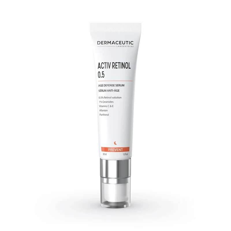 Appliquer Activ Retinol 0.5 sur le visage et le cou le matin ou le soir avant votre crème Dermaceutic.