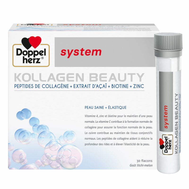 DOPPELHERZ KOLLAGEN BEAUTY est un système de traitement de 30 ampoules qui s’appuie sur les peptides du collagène pour renforcer votre peau. Le système Doppelherz KOLLAGEN BEAUTY est encore renforcé par son mélange unique de vitamines et minéraux antioxydants (la vitamine A, le zinc, le cuivre et la biotine), ainsi que d’extrait de baies d’açaï – tous les ingrédients qui favorisent un teint sain pour le visage et le corps. Doppelherz KOLLAGEN BEAUTY est un complément conçu pour une utilisation à long terme. Un effet est visible après environ 4 à 8 semaines. Il soutient la “renaissance” et l’amélioration de la fermeté de la peau grâce à ses ingrédients de collagène de haute qualité. La consommation orale de collagène peptides a un effet positif sur l’apparence. Les rides et les ridules du visage sont atténués. L’élasticité de la peau est améliorée. De plus, un effet de traitement des cicatrices est obtenu.