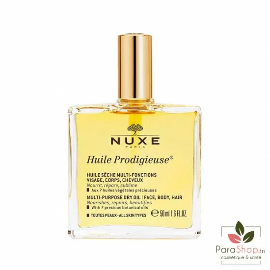 NUXE Huile Prodigieuse Le soin mythique aux 7 huiles végétales précieuses et à 98% d’ingrédients d’origine naturelle, Nuxe huile prodigieuse offre une hydratation longue durée sur la peau du visage et du corps. Son action anti-oxydante, son effet “bouclier anti-pollution et son effet sur la réduction de l’apparence des vergetures en font votre allier au quotidien. Grâce à sa texture huile sèche inimitable et son parfum addictif aux notes solaires et sensuelles, l’Huile Prodigieuse procure un vrai moment de plaisir.