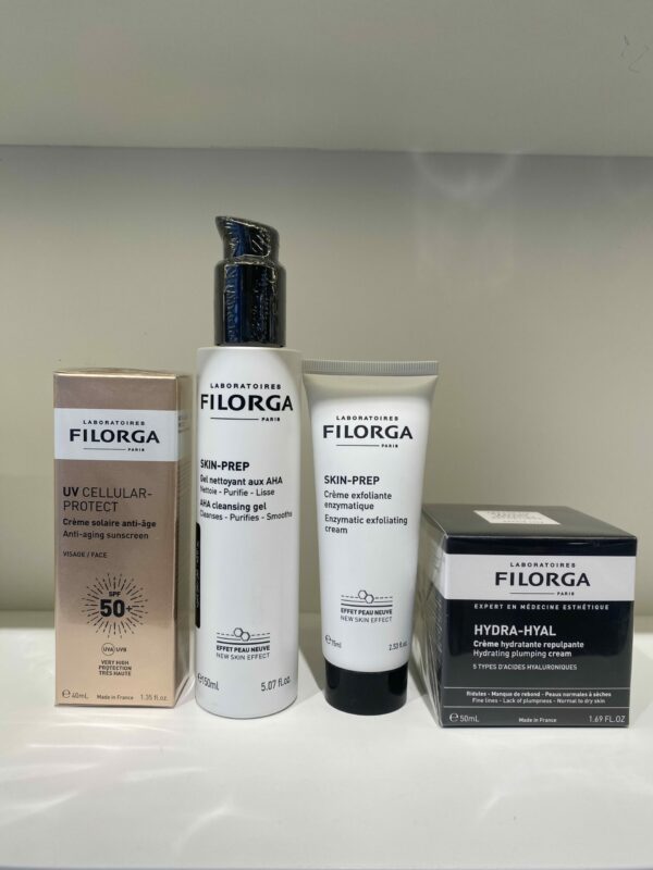 Routine Filorga complète associant nettoyage, exfoliation, hydratation repulpante et protection solaire anti-âge, pour une peau lisse, lumineuse, repulpée et protégée au quotidien.