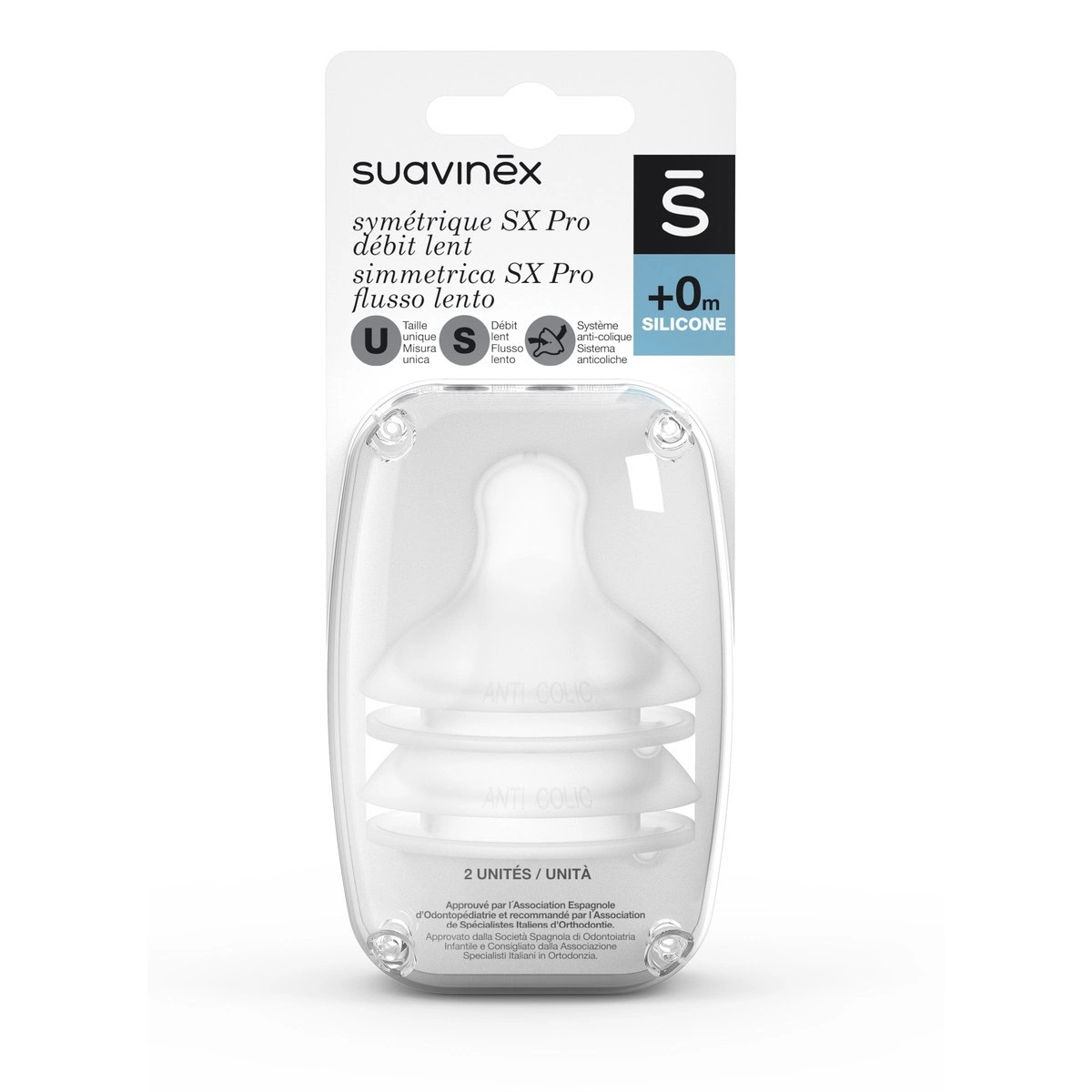 Suavinex 2 Tétines Symétriques SX Pro Débit Lent 0 Mois et + sont des tétines symétriques en silicone au débit lent, avec un système anti-colique.